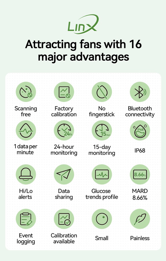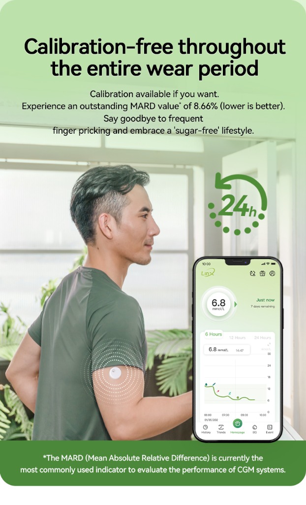 Mean Absolute Relative Difference (MARD) is the gold standard for measuring CGM accuracy. LinX achieves an exceptional 8.66% MARD — meaning the sensor readings closely match lab-grade blood glucose measurements.